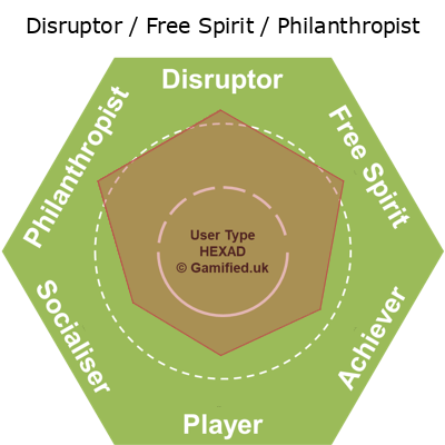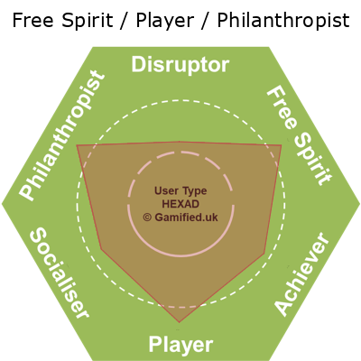 | Disruptor / Free Spirit / Player / Philanthropist / Socialiser | FPSA | 17% | 17% | 13% | 17% | 17% | 17% | Image |